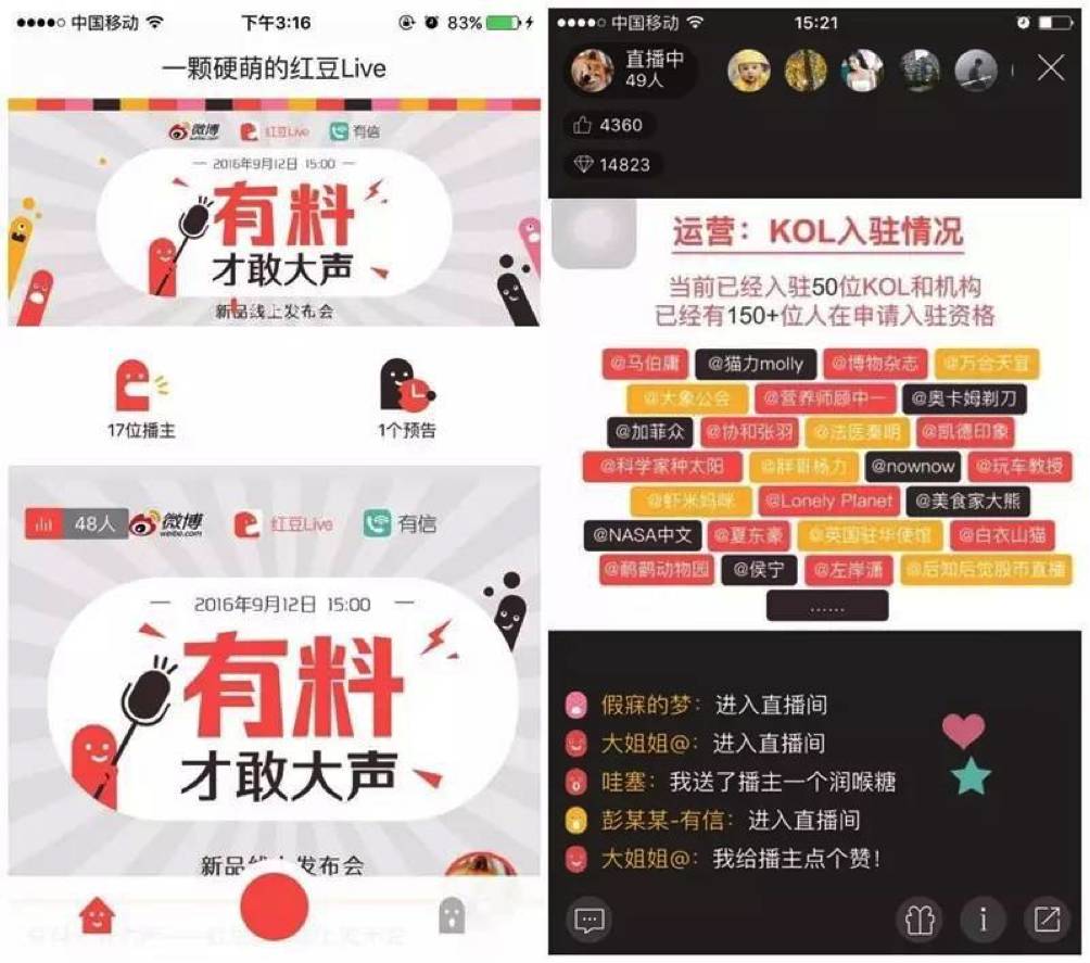 一个是周末的大事件,时隔六年,天后王菲宣布将于今年末再次开办个人演唱会,发布会上她不止一次强调,演唱会的目的只是想单纯尝试网络直播这种新形式,合作方是腾讯视频;另一个是地铁里随处可见的范冰冰为花椒直播代言的花式海报,看得出砸了不少钱;还有,同样是上周,媒体铺天盖地的报道,继一直播之后微博又和有信公司联合推出了一款全新的语音直播产品“红豆Live”。