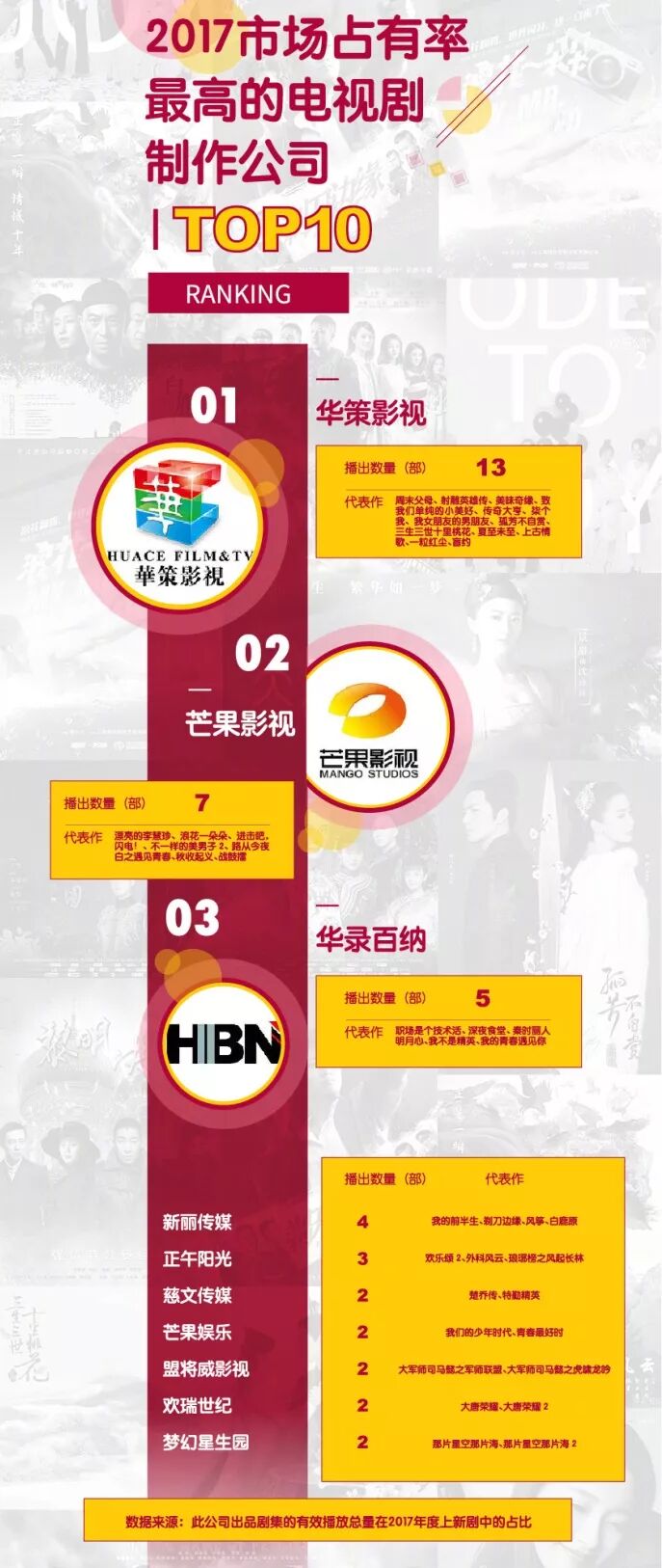 2017市场占有率最高的电视剧制作公司TOP10:华策影视、芒果影视、华录百纳、新丽传媒、正午阳光制作公司等头部制作公司稳居前五。
