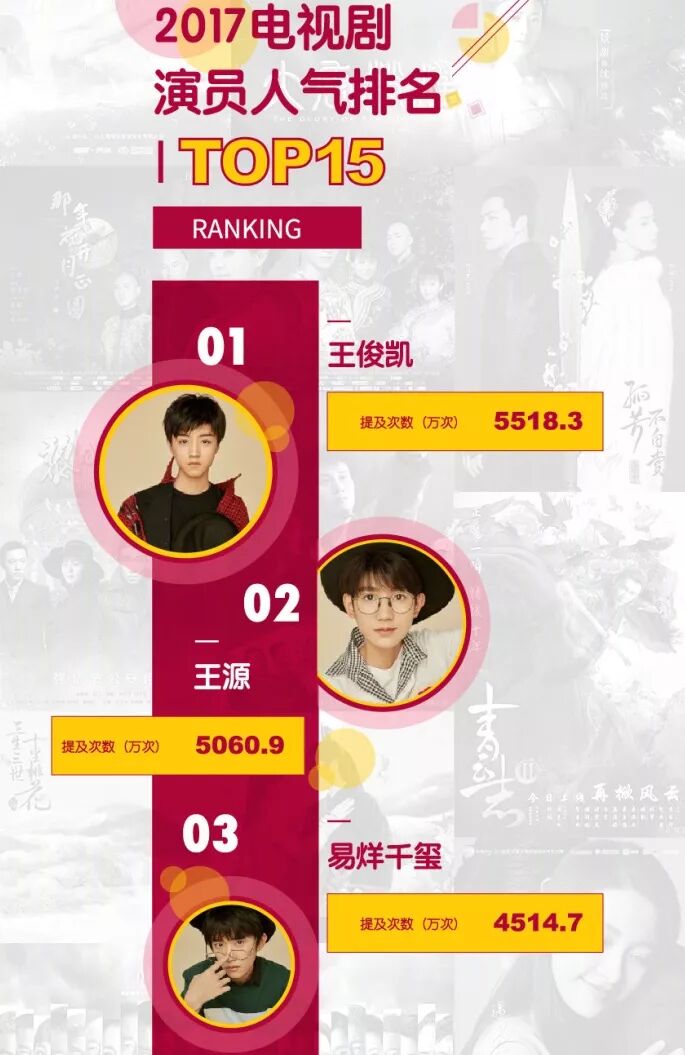 2017电视剧演员人气排名TOP15:王俊凯、王源、易烊千玺,tfboys三位成员当之无愧霸占榜单前三。