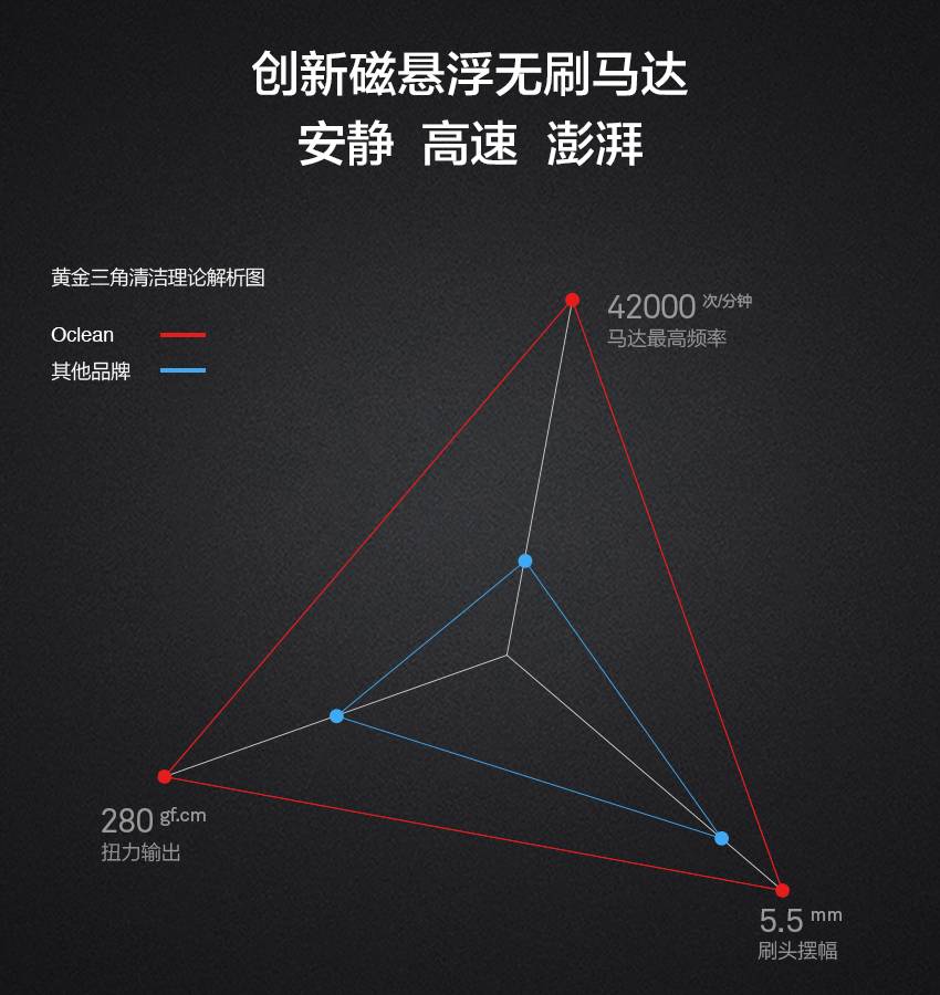 Oclean 联合金龙机电共同研发全新一代磁⼒声波马达,根据电动牙刷使用特点深度定制。全新的专利结构设计,动力提升近20%;寿命达800小时,可使用超过30年,是现有同类产品马达寿命的5倍以上;同时马达最高震频高达每分钟42000次,拥有目前最强的280gf.cm扭力输出。