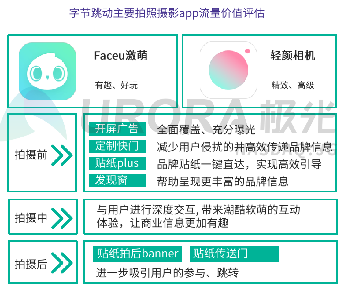 在文章的第一部分,我们讲过拍照摄影app与做图工具不一样,它是一个传播的起点,所以在这类app上营销,不是一个简单的植入或是贴片,而是要对流程重新设计,环环相扣。Faceu激萌和轻颜相机,在拍摄前、拍摄中和拍摄后三个产品体验步骤分别设置了多样化的广告营销方式,实现流量营销价值。
