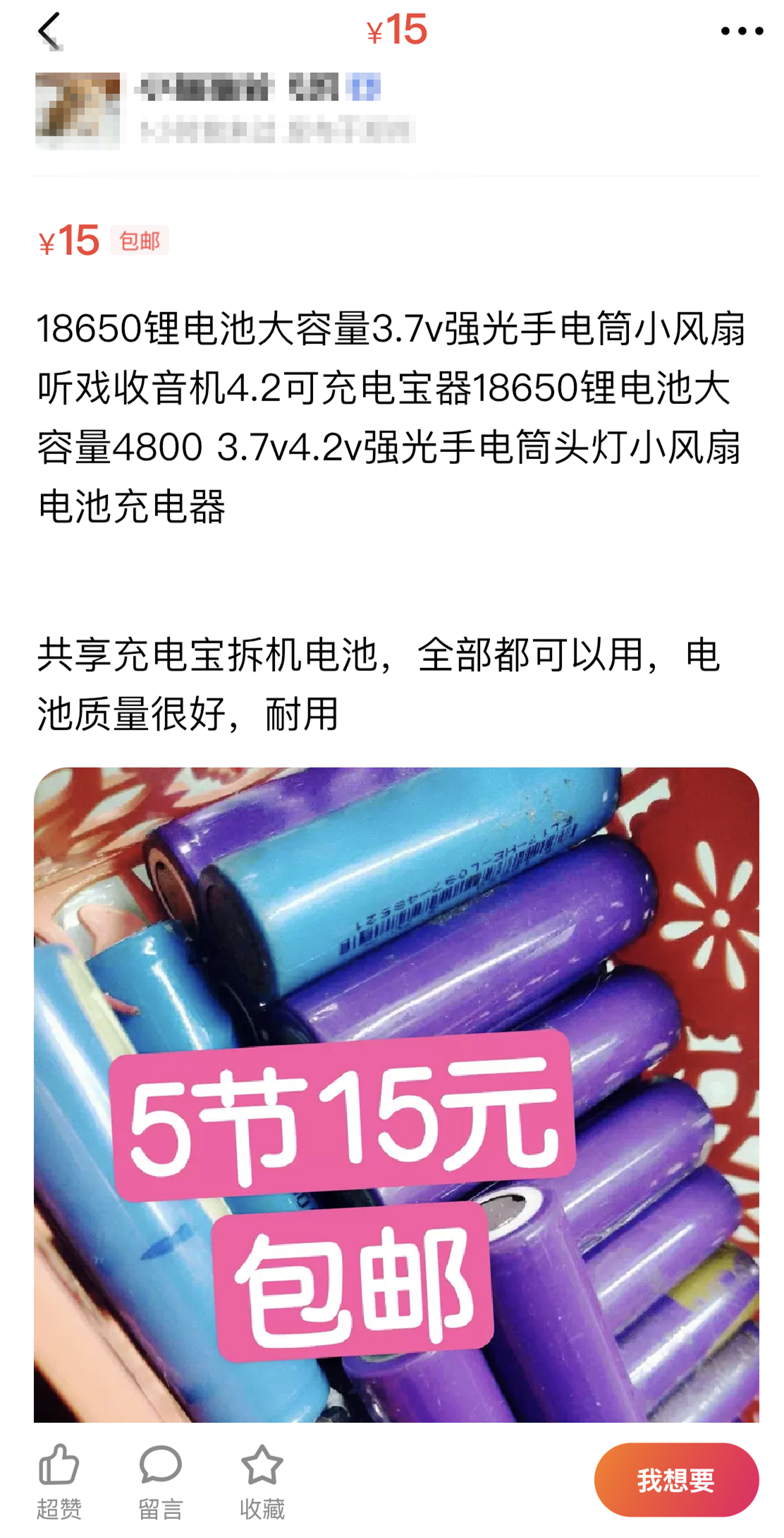 大规模出售共享充电宝,类似当初那些将共享单车卖到废品收购站的行为,不仅涉嫌违法而且会受到监管,因此,在成品销售遇阻的情况下,有人退而求其次,选择将共享充电宝拆卸成零件分开出售。可以看到,目前仍有大量的拆机电池出售,5节只需要15元,卖家也明确标注这些电池就是来自于共享充电宝。
