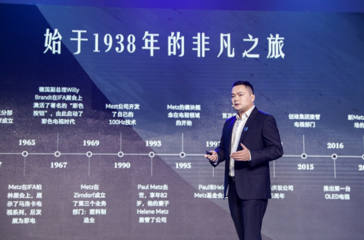 活动现场,历史长廊开启了百年美兹的时光隧道,带领宾客们一同领略了美兹自1938年至今的发展征程。回望成立之初,德国工程师Paul Metz联合12名创业者组建团队,正式成立了以自己姓氏为名的公司,美兹(Metz)逾80年的品牌历程自此开启。作为源自德国的百年品牌,从最初的收音机制造,到生产闪光灯和电视机,美兹自创立起便不断扩张品牌版图,通过代代传承与坚持不懈的创新精神,持续谱写品牌百年传承的辉煌传奇。美兹旗下OLED电视更在2018年被德国纽伦堡政府指定为国际交流的“外交国礼”,成为中德两国友谊外交形象。