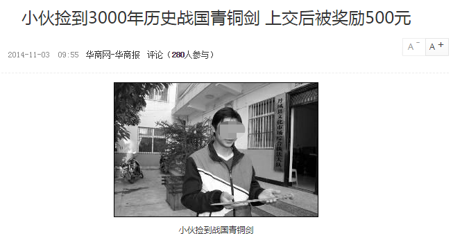 所谓“捡到陨石要上交给国家,然后被奖励500块和一面锦旗”的说法,基本都是由2014年一则“小伙捡到3000年历史战国青铜剑,上交后被奖励500元”的新闻衍生而来的。