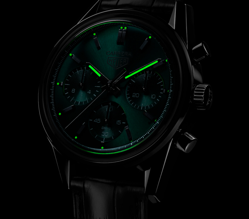 该款表为致敬诞生于1963年的原版腕表Ref. 2447 Carrera,以全新的手法融入蓝绿两色调和而成的的色彩设计,并采用更大直径的39毫米表盘。侧看上去,蓝宝石水晶罩在蓝绿色太阳纹磨砂表盘之上,当阳光把它擦亮,尤显得熠熠生辉。