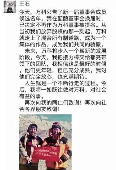 6月21日,王石在朋友圈宣布董事会换届时,将不再作为万科董事被提名。此外,王石表示,“未来,万科将步入一个崭新的发展阶段。今天,我把接力棒交给郁亮带领下的团队,我相信这是最好的时候。”