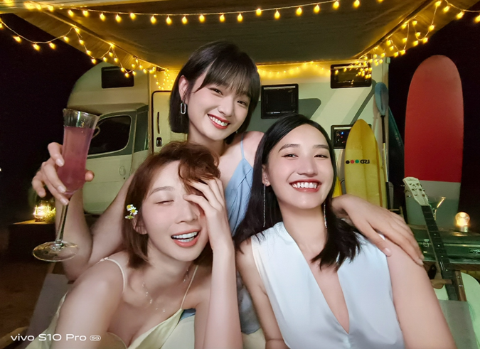 vivoS10系列采用4400万像素AF超清主摄+800万像素超广角镜头的组合,屏幕顶端缝隙隐藏两颗LED柔光灯,为用户在极夜环境下的面部提供均匀、立体的补光效果。在特定自拍模式下,还可与屏幕柔光环配合,以组合的形式最大程度地对面部进行补光。超级夜景算法新增加了对前置超广角镜头的支持,同时可以叠加柔光灯开启,夜晚多人欢聚时刻也能被更好记录。