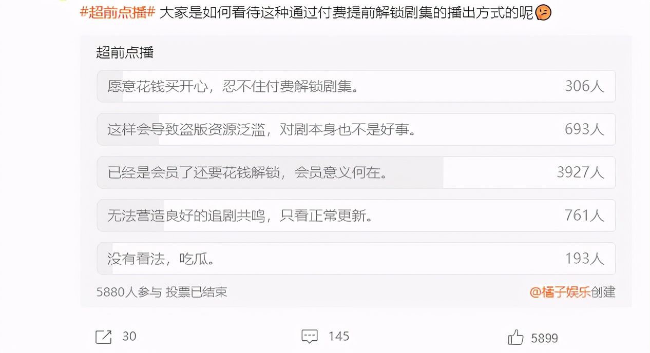 “天下苦超级点播久矣”,并非一句玩笑话。@橘子娱乐 创建的关于超前点播的投票中,共有5880人参与,3927人质疑会员还要花钱解锁,会员意义何在。仅有306人认为花钱买开心,会忍不住为此付费。