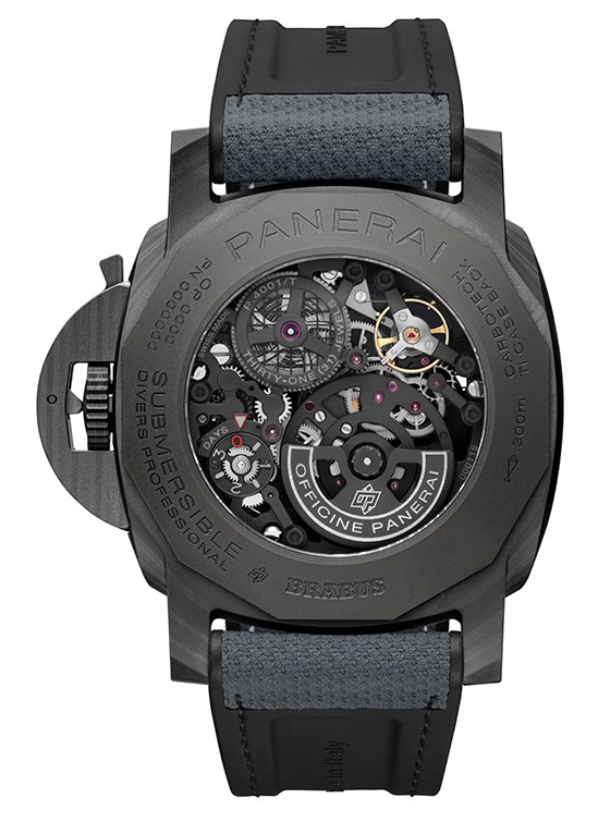 这款47毫米的手表采用沛纳海的Carbotech复合材料,具有该品牌有史以来第一个镂空自动机芯。P.4001/s机芯采用高密度钨微转子和两个主弹簧管,提供72小时的动力储备。还配有一个单向旋转面板,用于潜水计时,可防水300米。