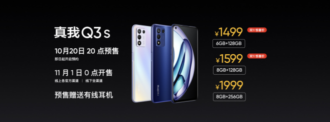 真我Q3s系列售价1599元起,首次将骁龙778G带到1500元价位段。真我Q3s拥有6GB+128GB、8GB+128GB、8GB+256GB三个版本,双11惊喜价分别为1499元、1599元、1999元。